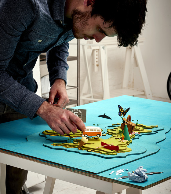 Kyle Bean constructs playful scenes and miniature simulacrums that draw out metaphors from the subject material, representing them through thoughtful and humorous handcrafted 3D illustration, in order to concisely communicate the services and attributes of a product or narrative